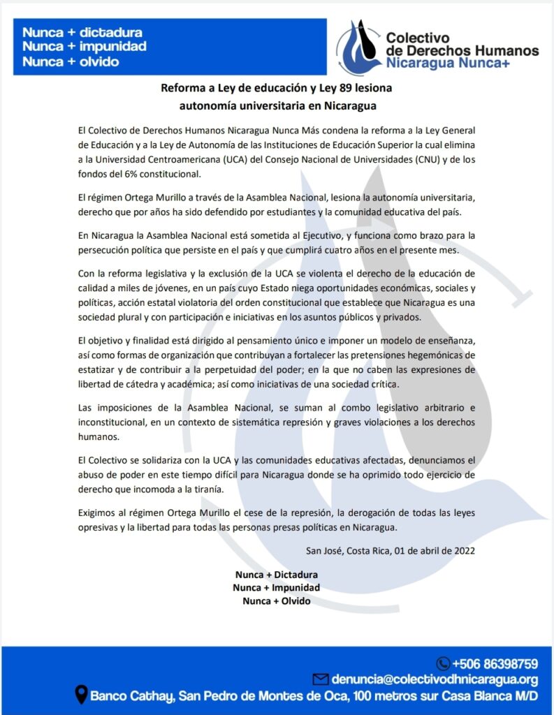 El Colectivo de Derechos Humanos Nicaragua Nunca Más condena la reforma a la Ley General de Educación y a la Ley de Autonomía de las Instituciones de Educación Superior la cual elimina a la Universidad Centroamericana (UCA) del Consejo Nacional de Universidades (CNU) y de los fondos del 6% constitucional.